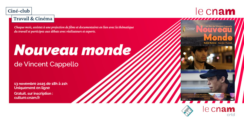 Projection du film "Nouveau monde"13 novembre 2025Webinaire - WebconférenceCoup de projecteur sur le film "Nouveau monde" du réalisateur Vincent Cappello dans le cadre du ciné-débat du Cnam qui mêle 7e art et sciences humaines en explorant les diverses facettes du monde du travail à travers l'objectif du grand écran et le regard d'enseignants-chercheurs. -