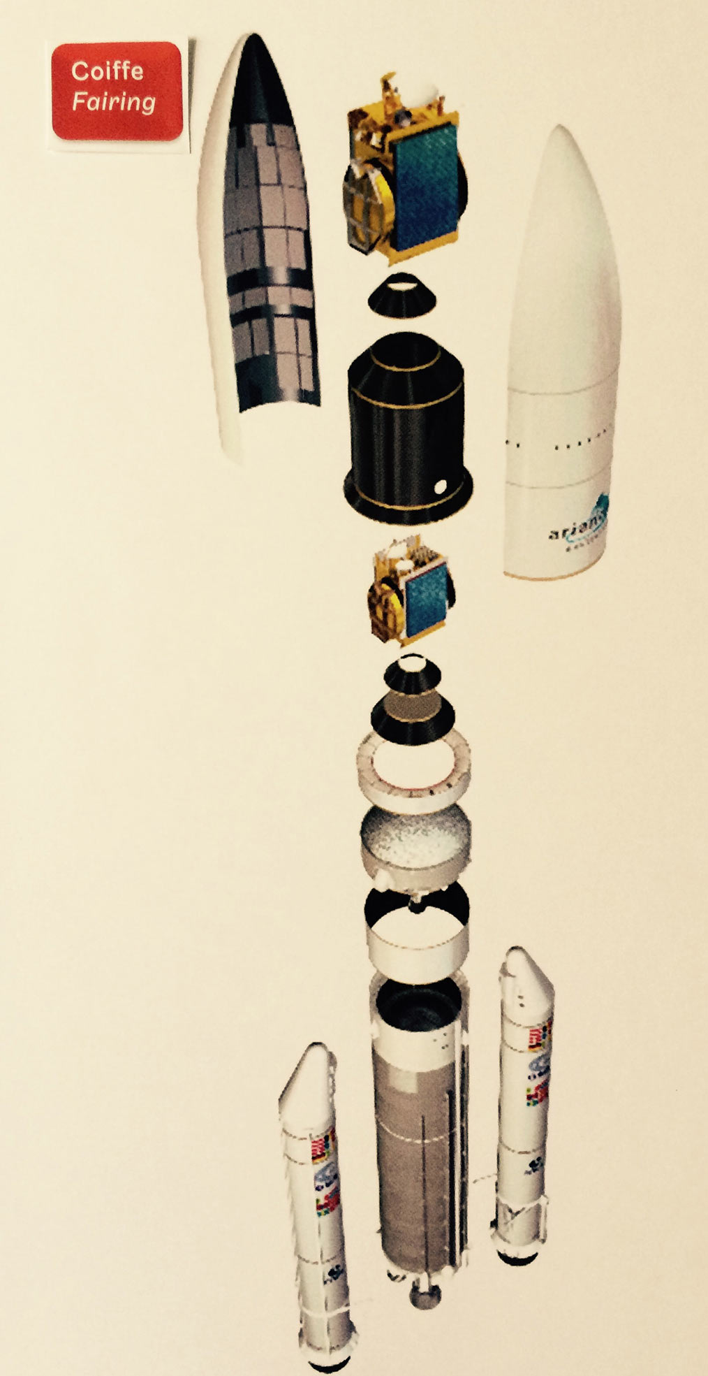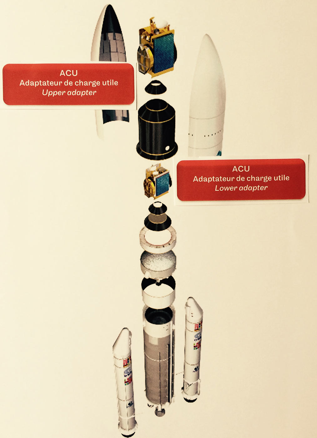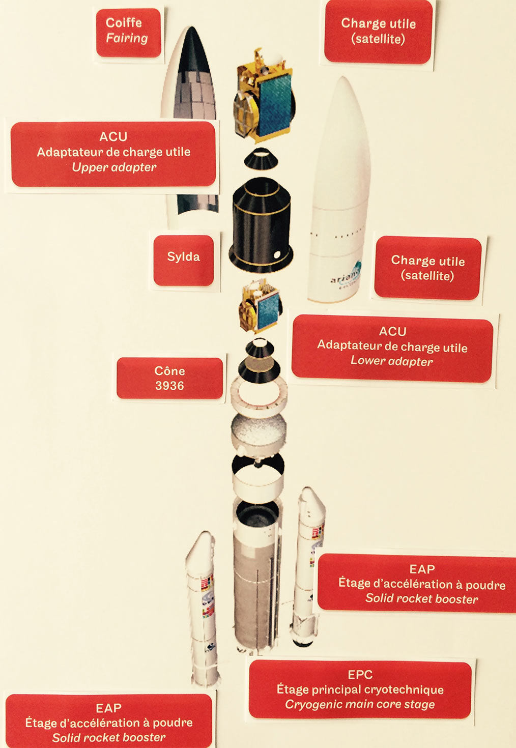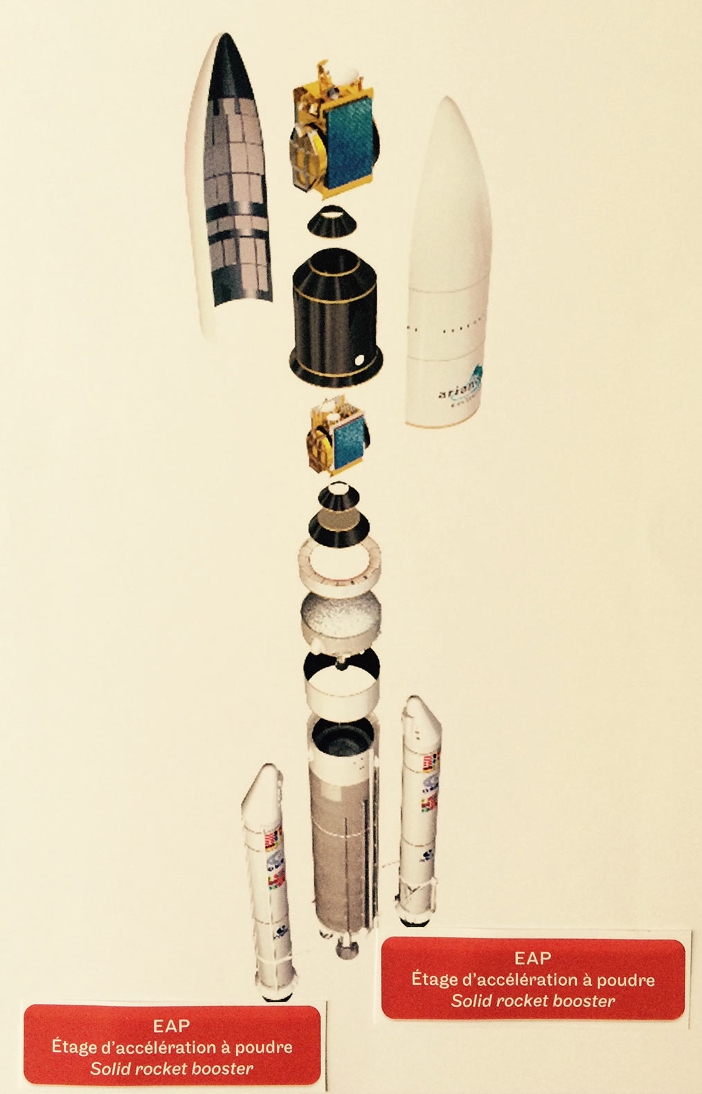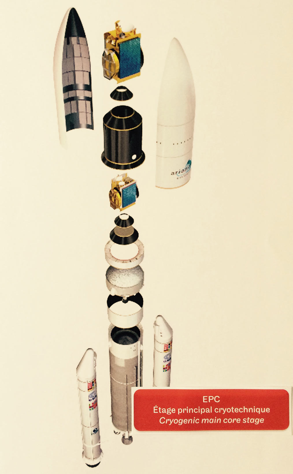 L’EAP, l’étage d’accélération à poudre, est la première partie éjectée après le lancement d’Ariane 5, suivi de près par l’EPC, l’étage principal cryotechnique. La coiffe, servant à la fois à l’aérodynamisme général du lanceur et à protéger les satellites, est le dernier élément à être éjecté, toujours suite à un choc pyrotechnique.