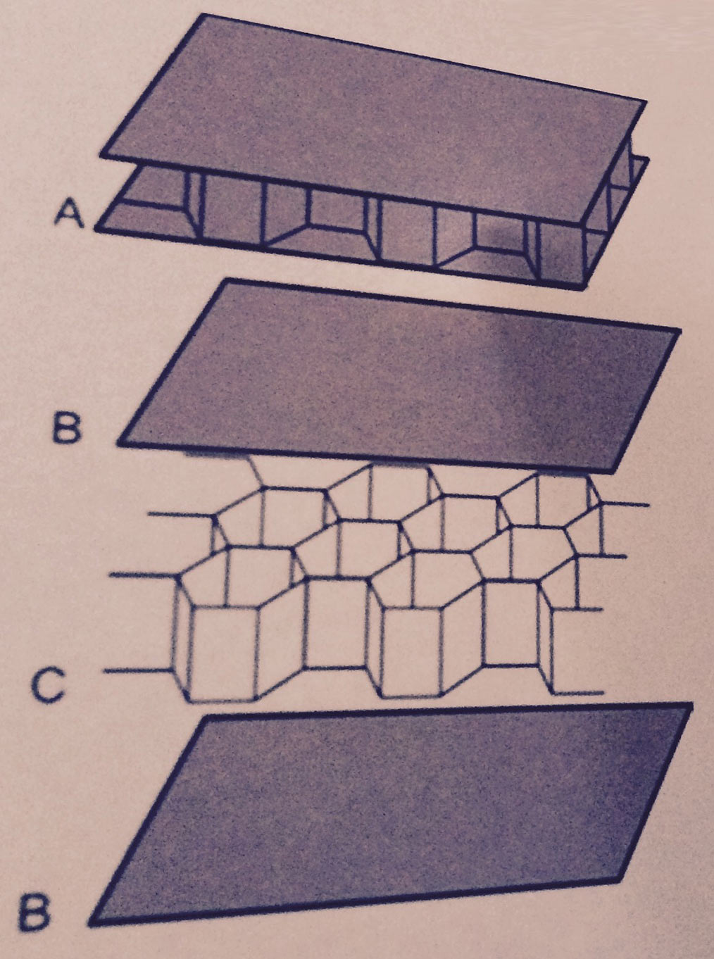 Il s’agit de l’assemblage d’au moins deux matériaux, ne pouvant se mélanger, et dont les propriétés se complètent formant ainsi un nouveau matériau plus fort et efficace. Parmi ceux-ci, il y a des matériaux sandwich. C’est le cas de celui composant les ACU d’Ariane : il s’agit d’une structure en aluminium dite « en nid d’abeille » prise en sandwich entre deux peaux stratifiées en carbone.